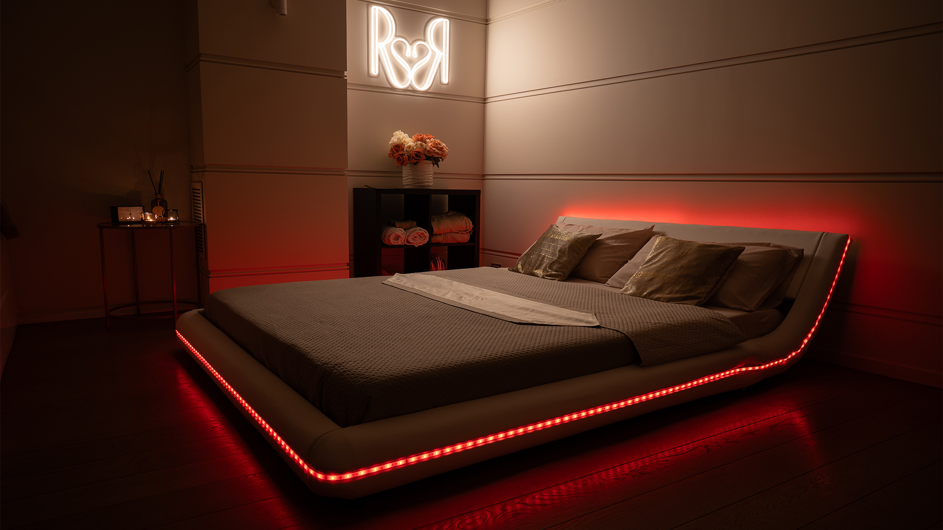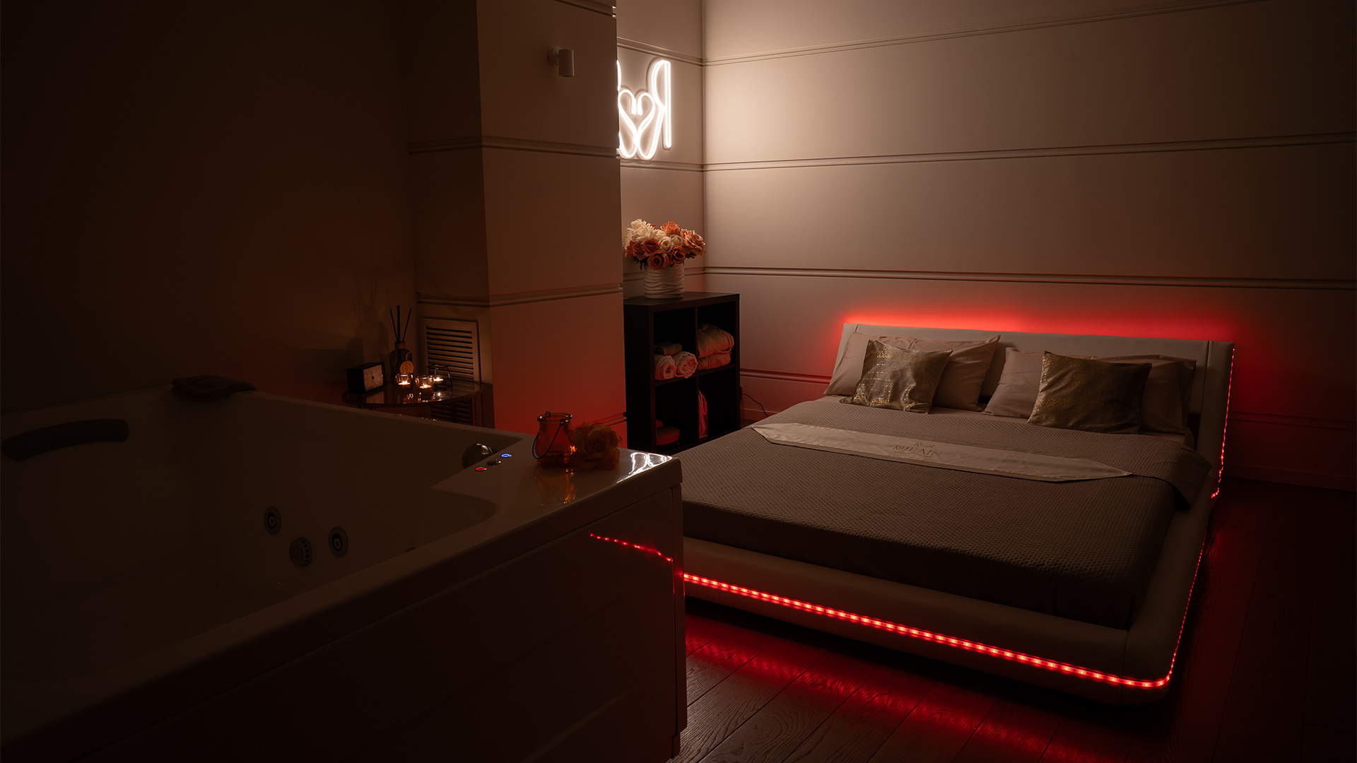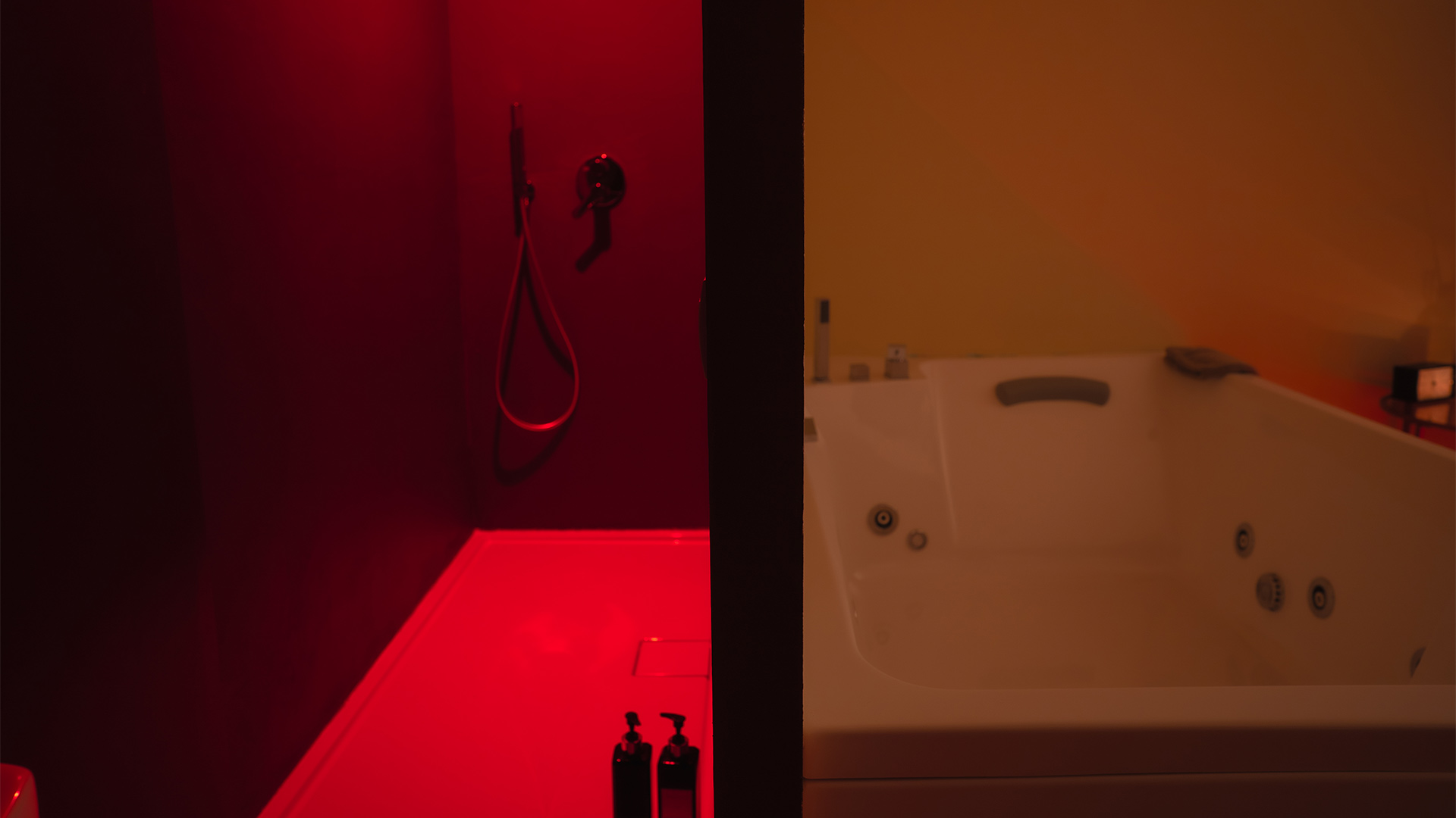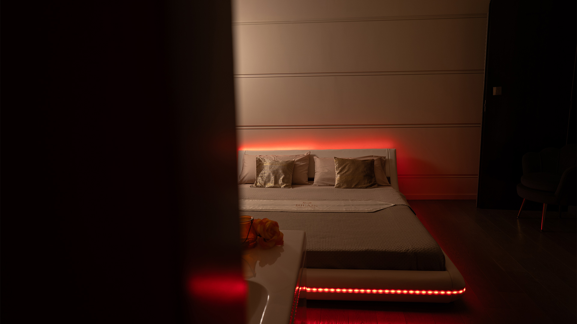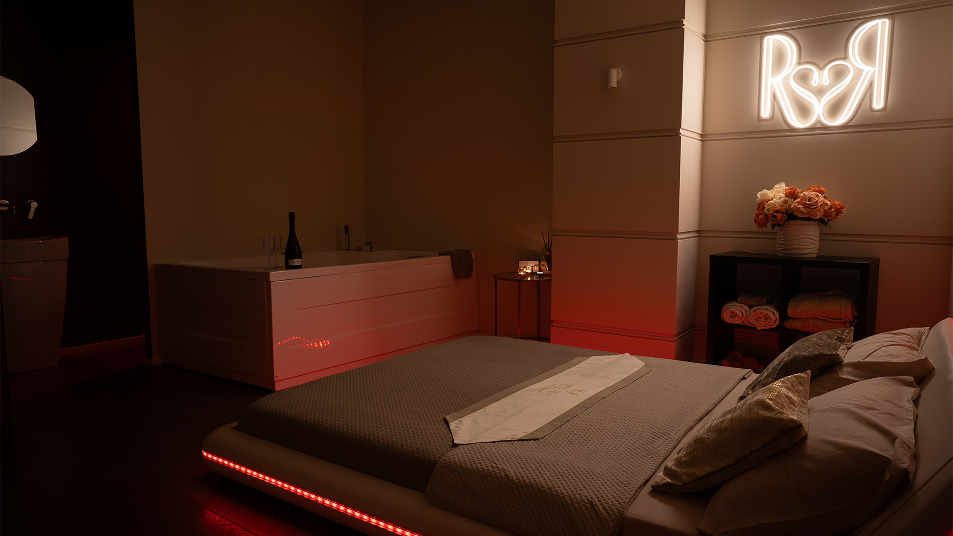 Un letto king, morbido e accogliente, diventa il fulcro di un’esperienza sensoriale. Le tonalità calde e il design minimal invitano al relax, mentre la musica in sottofondo accompagna ogni gesto. Un luogo di piacere che garantisce discrezione assoluta per vivere ogni momento con naturalezza.
